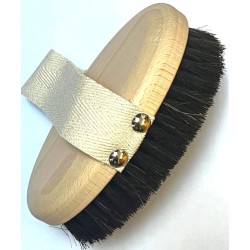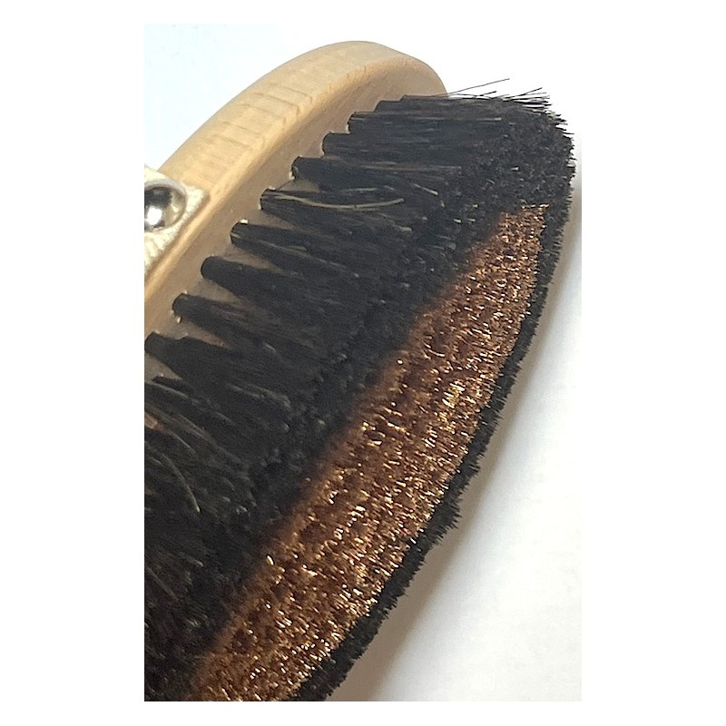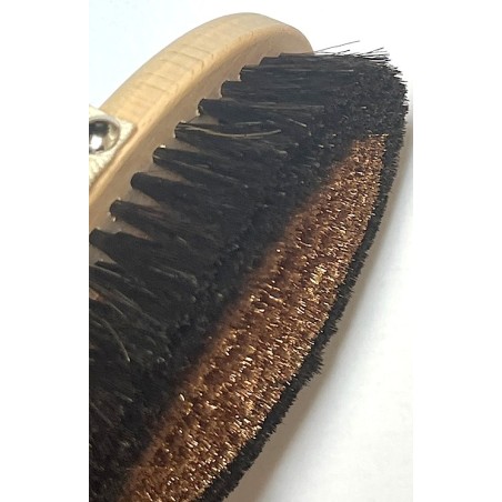 Stworzyliśmy perfekcyjną szczotkę do ciała, absolutny rarytas, według starych metod. Bardzo subtelny i delikatny drut wykonany z miedzi działa kojąco na organizm, rozładowując przy tym stany napięciowe, walczy skutecznie z celullitem. Konsekwentne jej stosowanie doprowadza do pomniejszenia żylaków. Można również używać przy dekolcie i piersiach. Specjalne owalne przycięcie włosia i drutu sprawia, że szczotka spełnia najwyższe standardy dostępne na rynku, według nas nie ma lepszej szczotki jonizującej na rynku.
